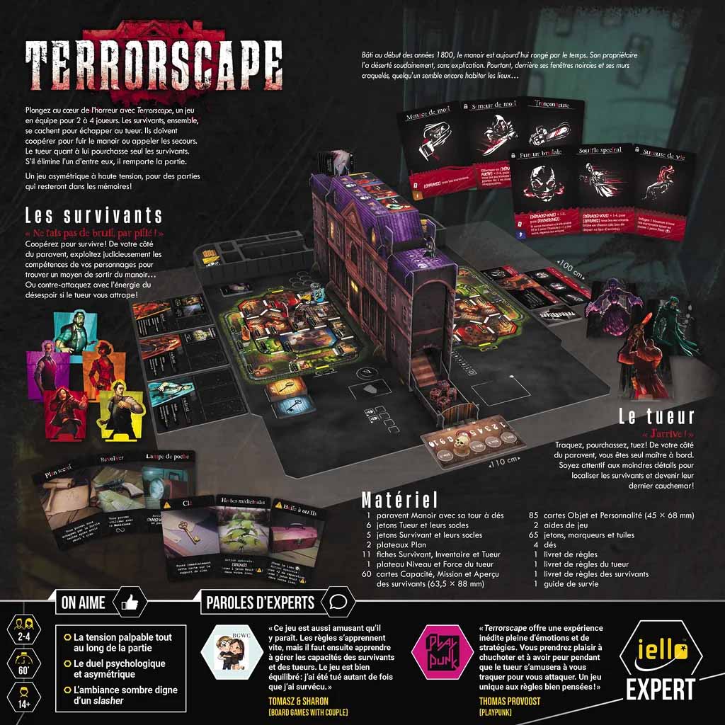 Terrorscape est un jeu d’horreur asymétrique en équipe. Vous pouvez jouer le rôle des survivants ou du tueur. Les survivants coopèrent pour s’échapper du manoir en cherchant 5 clés ou en réparant la radio pour passer un appel d’urgence. Le tueur est seul contre les survivants. Le tueur doit localiser les survivants par leur bruit ou par leurs compétences et décider comment les éliminer.